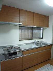 リピーターの方よりご注文いただきました。経年約25年で内装含めたキッチンリフォームをご検討中でした。床フローリング貼り替え、壁クロス貼り替え、天井塗装工事も行いました。壁面のタイルがキッチンパネルになり掃除がしやすいと喜んでいただきました。